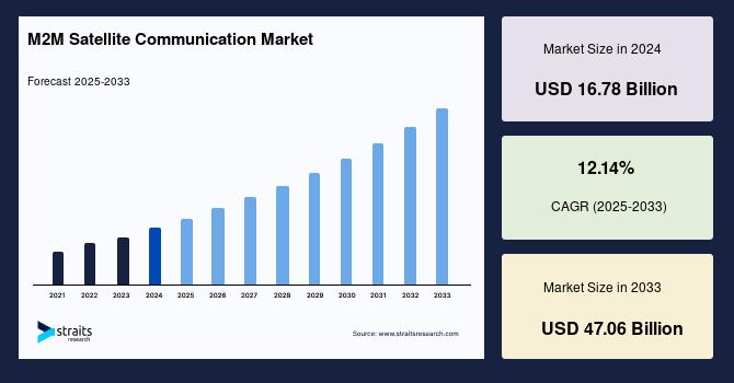 According to StraitsResearch, the global m2m satellite communication market size was valued at USD 16.78 billion in 2024 and is estimated to reach USD 47.06 billion by 2033, growing at a CAGR of 12.14% during 2025-2033.